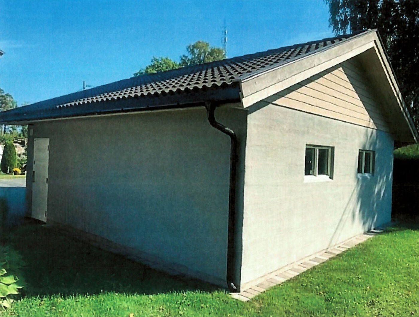 Våre murgarasjer er på 49m² og har en støpt plate på mark med stålglattet gulv, murte yttervegger i 15cm leca og slammet puss på utsiden. Komplett tak med sementtaksten på 22 grader, liggende kledning i gavler og takrenner med nedløp.